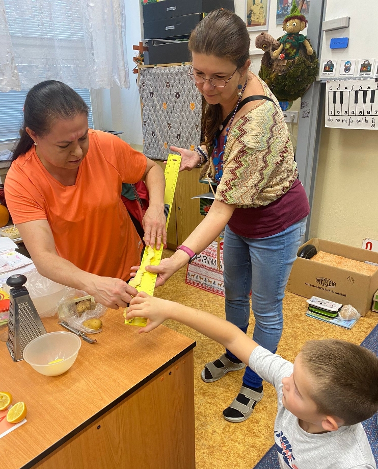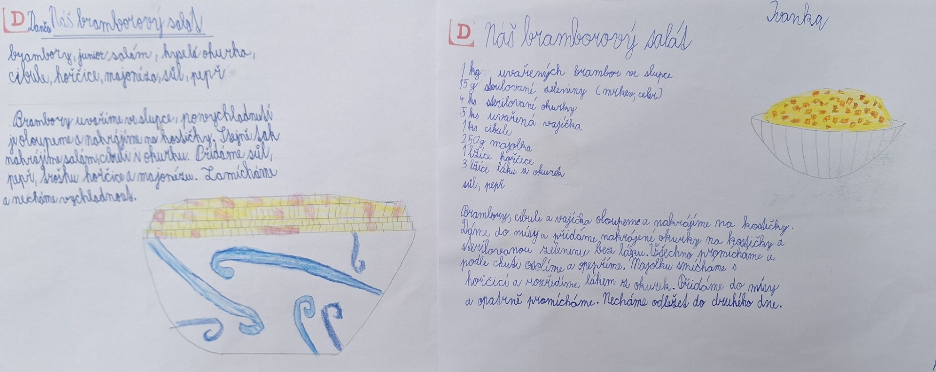 S tématem nám tentokrát pomohla i učebnice Českého jazyka, krásně jsme se s autory sešly! Slova příbuzná, pracovní postup při přípravě bramboráku, trénink slovní zásoby…. (ta se vždycky hodí)😊. Seznámili jsme se s básničkou Josefa Kainara Máma smaží bramborák (až se nám sbíhaly sliny, takhle přesně to v básničce je)😊. A krátký příběh o tom, jak si holčička z Vietnamu popletla bramborák a bramborový salát a jak je někdy pro děti z jiných zemí těžké učit se v českém jazyce.