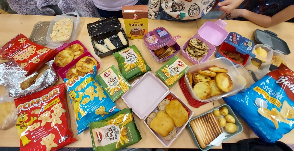 Tentokrát jsme zapojili i rodinné příslušníky: první úkol zněl Napiš a nakresli váš recept na bramborový salát, druhý úkol Přines ochutnat cokoli z brambor a třetí úkol Přines bramboru zajímavého tvaru. Sešlo se nám velké množství receptů na salát, včetně zahraničních variant….vícejazyčné třídy mají rozhodně své výhody😊. Raut bramborových jídel byl rovněž dobře zásobený, platí totéž co u salátu. No, a tvary brambor, jaké svět neviděl…k těm se ještě dostanu.