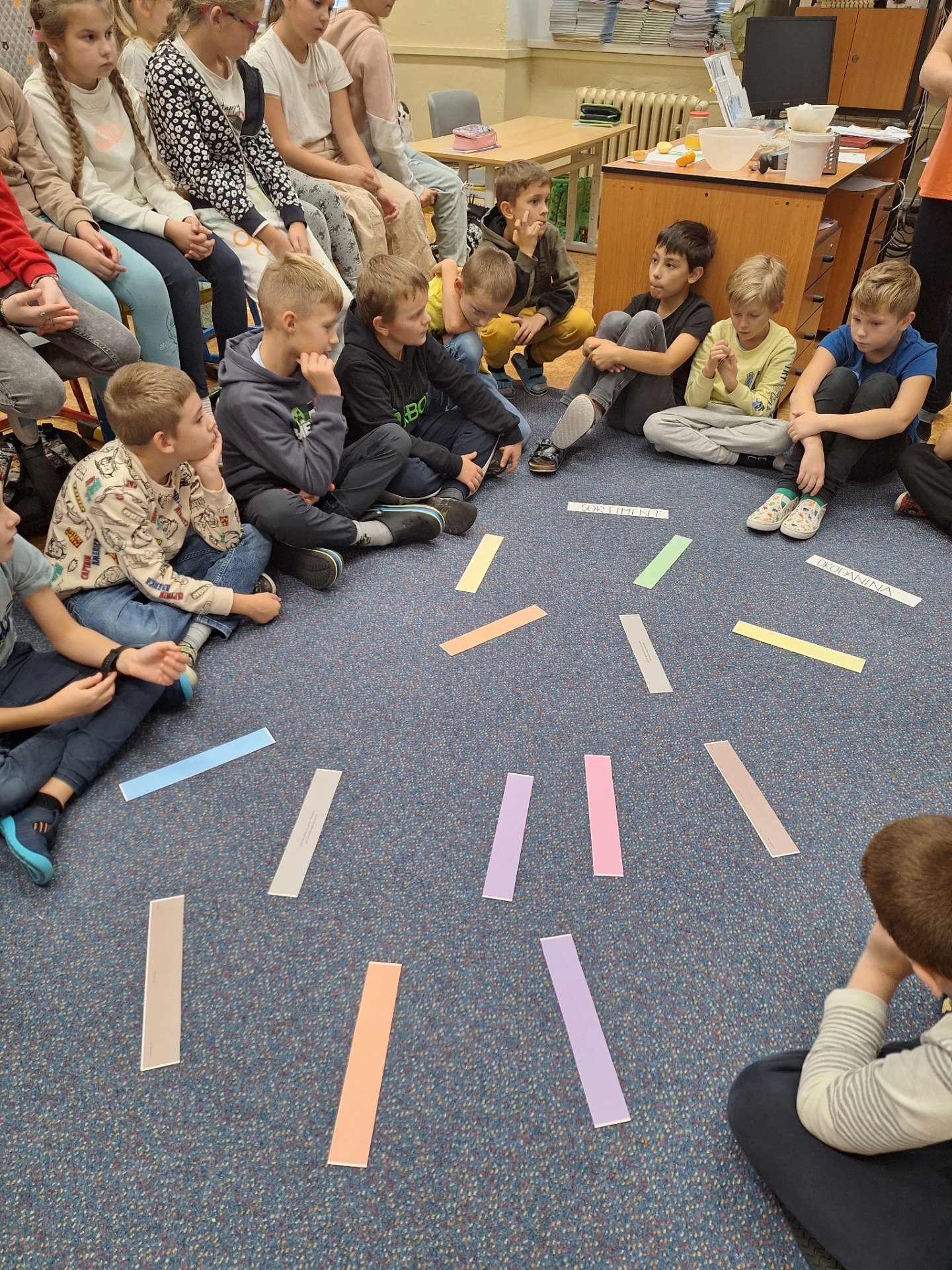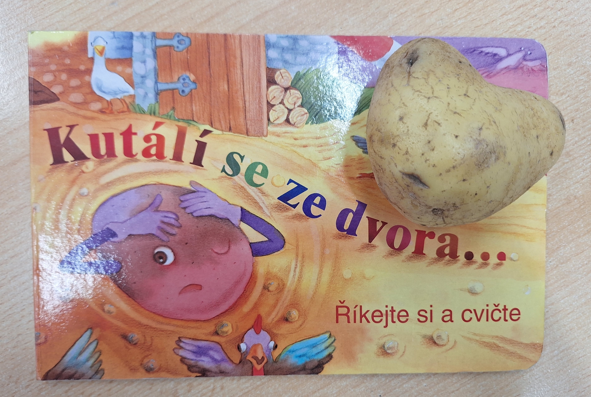 Den B (jako brambory, to dá rozum😊) jsme zahájili návratem do věku asi tak 3 roky a všichni jsme si odrecitovali a zacvičili populární básničku Koulela se ze dvora veeeelikánská brambora. Ze školky, případně ze Sokola, ji znali všichni. A hned poté jsme se vrhli na činnost intelektuální😊. Děti se rozdělily do skupinek a každá skupinka si přečetla krátký článek zaměřený na pěstování brambor. Zároveň jsme na proužky papíru připravily slova (neobvyklá, dětem neznámá). Po přečtení článků se všechny skupinky sešly na koberci, postupně jsme obracely proužky se slovy a skupinka, která na dané slovíčko narazila ve svém textu, ho ostatním dětem vysvětlila. A že to nebylo nic snadného!
