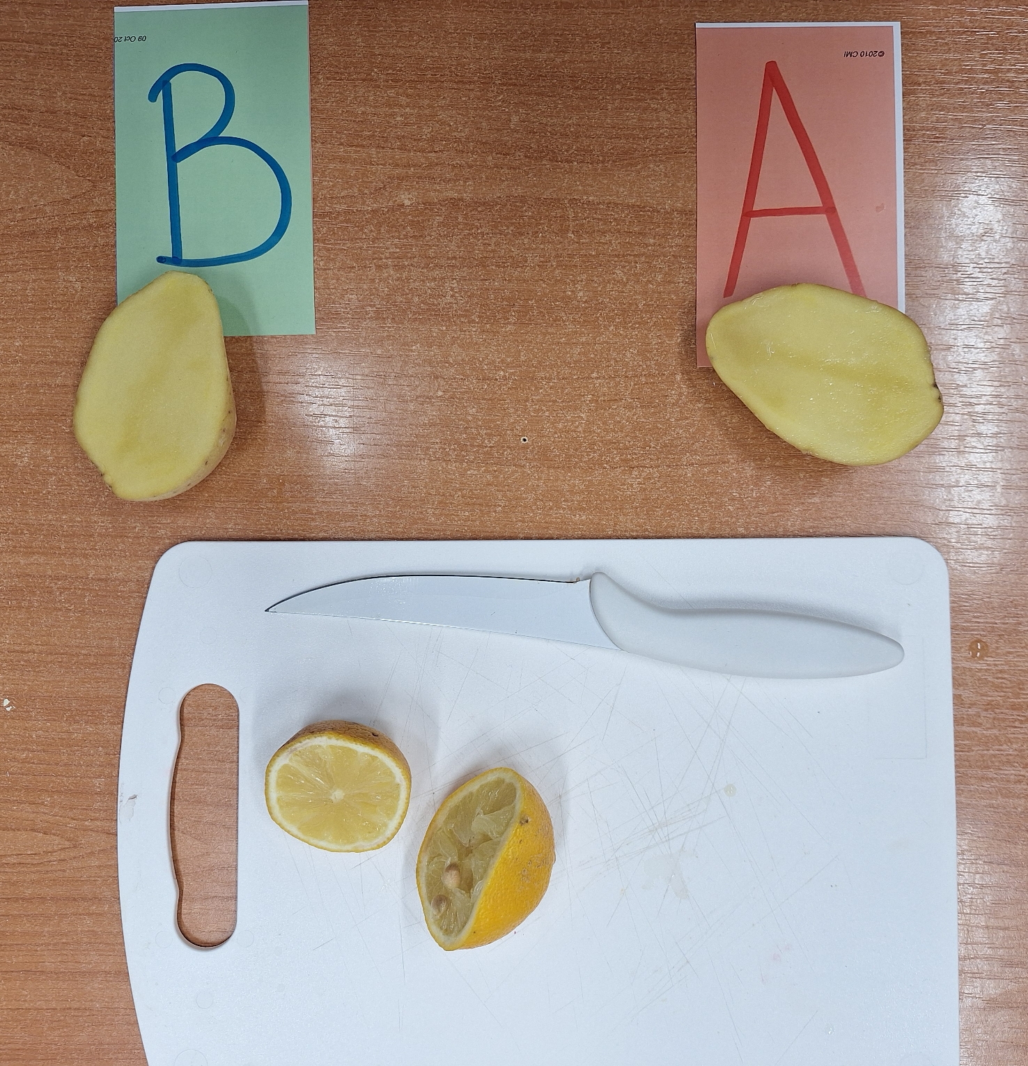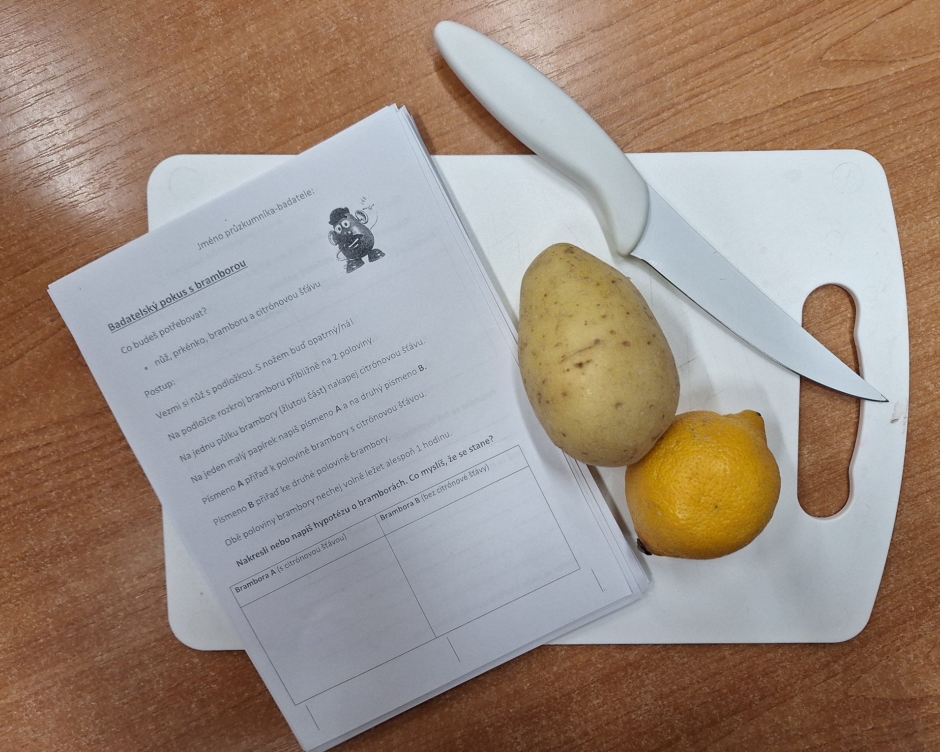 Vyzkoušeli jsme si i opravdové POKUSY…s hypotézou a ověřováním. Ano,ano….třeťáci – a už víme, co je hypotéza😊. První pokus jsme věnovali výrobě škrobu z nastrouhané brambory. Při strouhání všechny prstíky zůstaly celé. Cezení přes plátýnko se také podařilo. Při druhém pokusu jsme zkoumali, jak se mění rozříznutá brambora -usychá, hnědne, scvrkává se. Třetí pokus nám ukázal, jak je šikovná paní učitelka Alena. Tipli jsme si, jak je dlouhá slupka z jedné brambory a jestli se ji povede oloupat bez přetržení. Výsledek: Je šikovná. 45 centimetrů. Povedlo se😊. Dozvěděli jsme se, že z brambor se dá vyrobit elektřina. Kolik brambor by asi bylo potřeba na osvětlení celé třídy? Pokusy jsme si zaznamenávali na pracovní listy, prostě jsme už opravdoví výzkumníci.