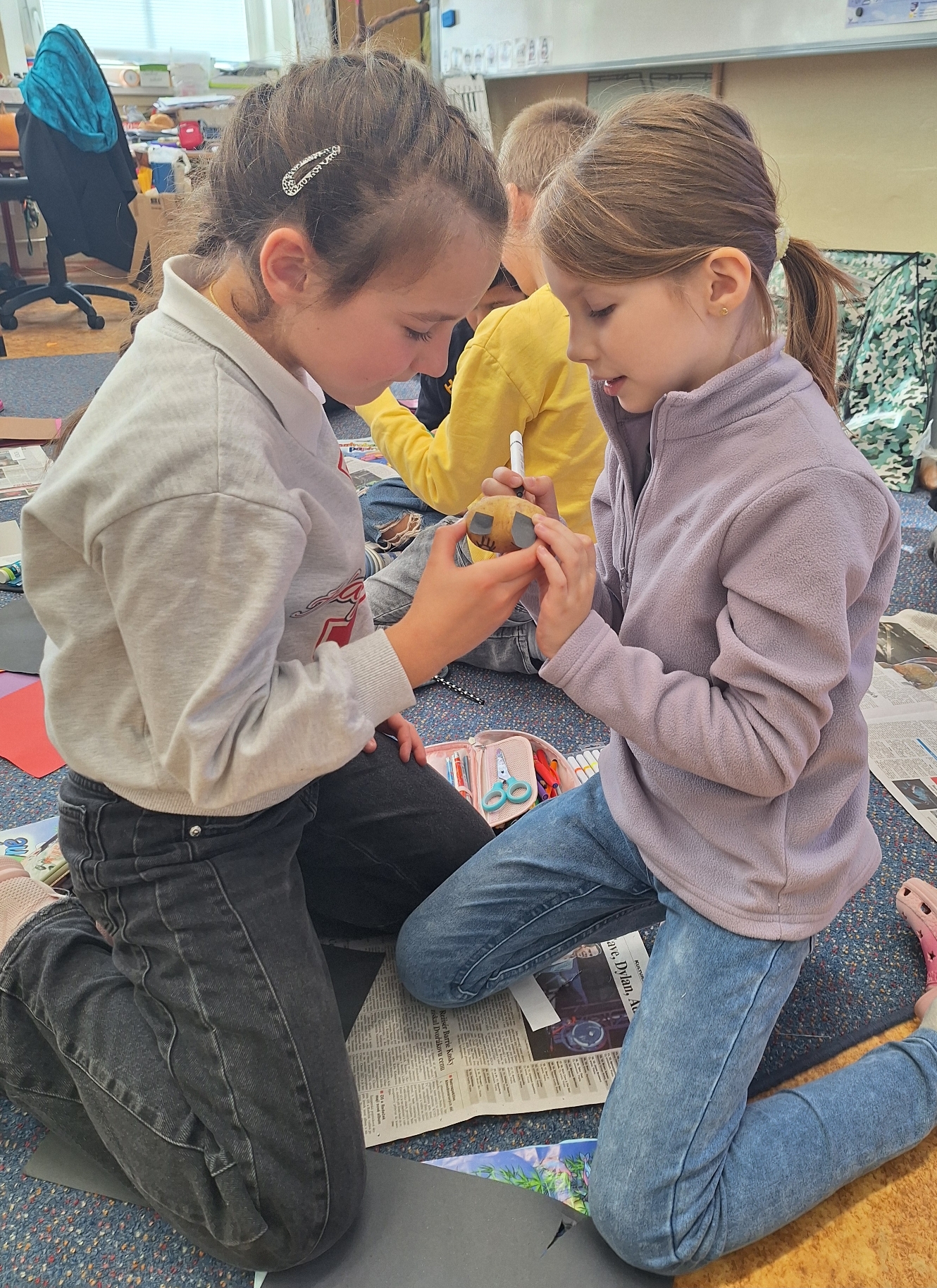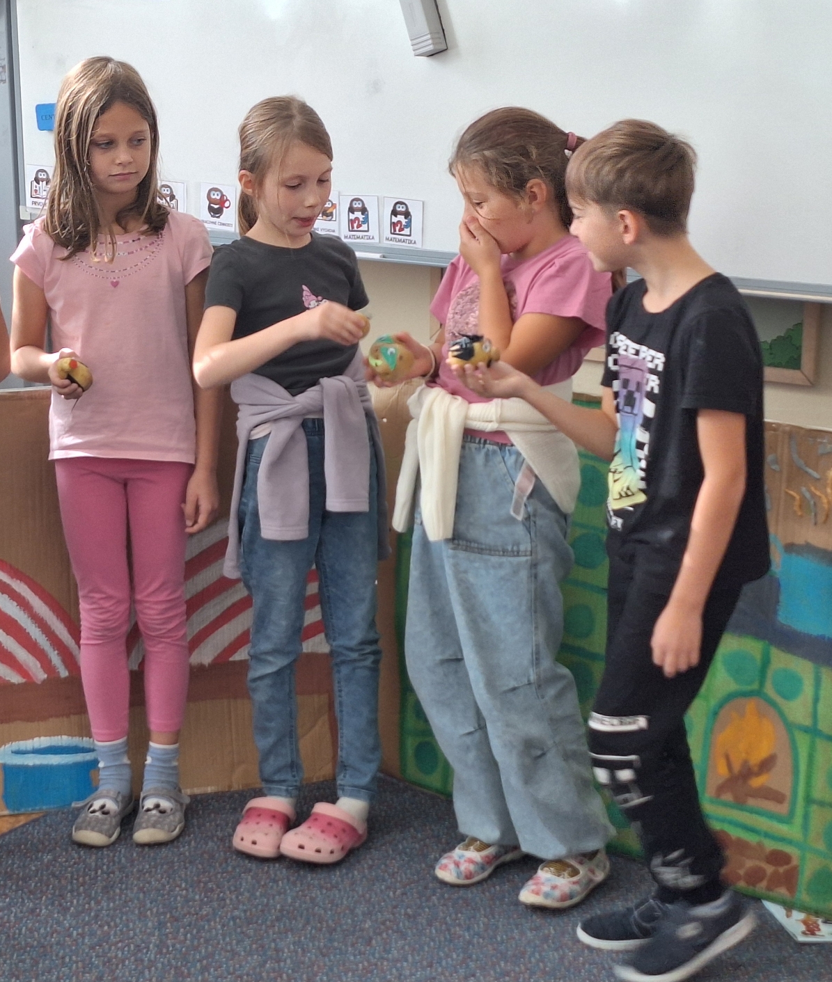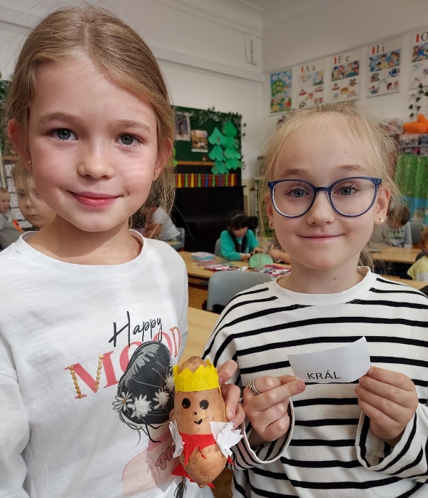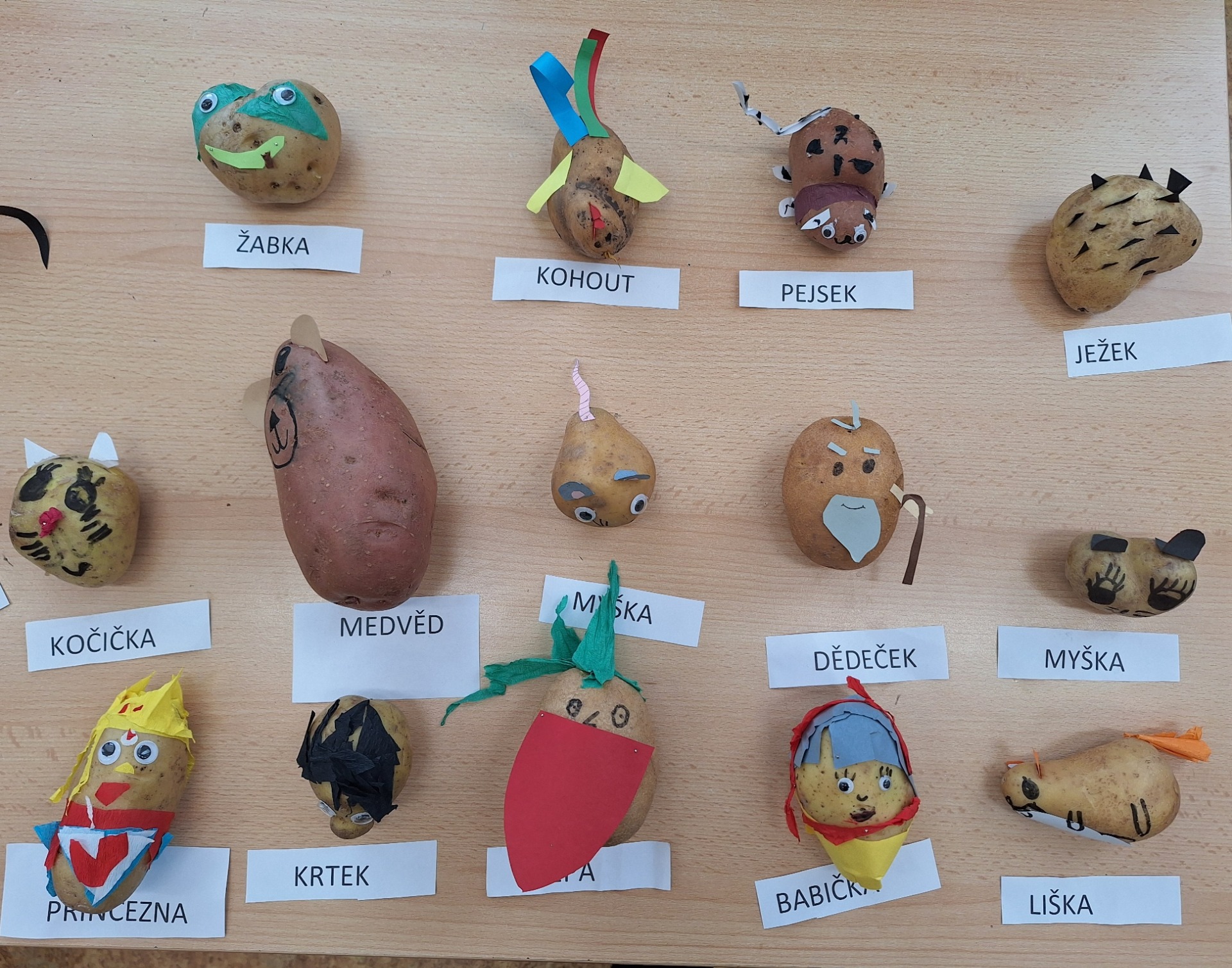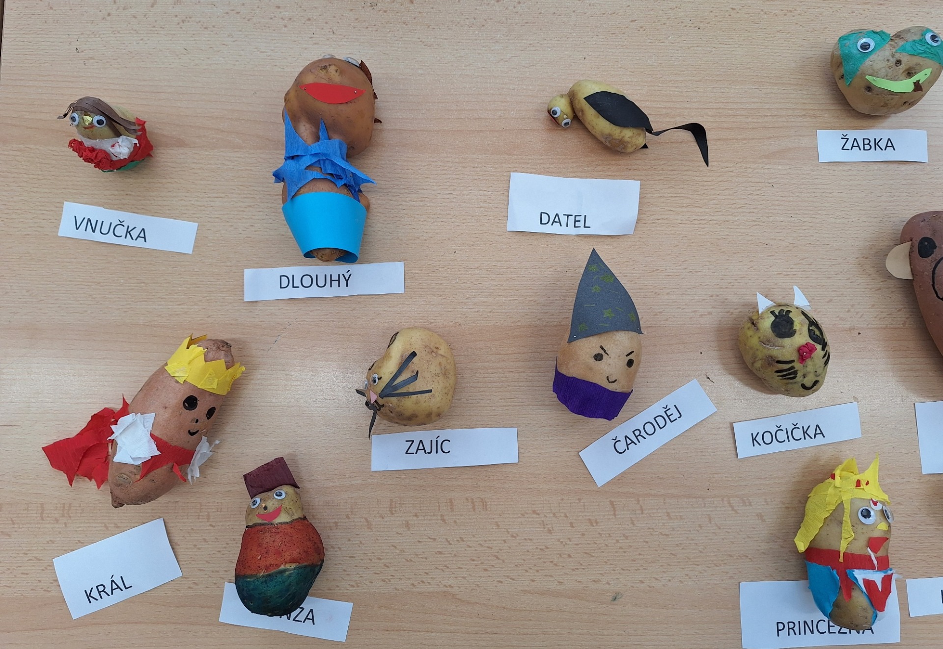 Na řadu přicházejí brambory ve svých nejpodivnějších tvarech a podobách! Děti vytvářely ve dvojicích vylosovanou pohádkovou postavu. Úkol zněl: Použij jakýkoli dostupný materiál, vyber si bramboru a vytvoř loutku 😊… Fantazie všech se rozběhla na plné obrátky a během chvíle vznikaly neskutečná výtvarná díla. Pan Trnka by byl jistě ohromen……my také. Opět se přesvědčujeme, jak jsou děti vynalézavé, nápadité a kreativní! Poté si děti vytvořily svoji ,,pohádkovou skupinu" a po krátké poradě se sestavením scénáře byly sehrány tři pohádky: