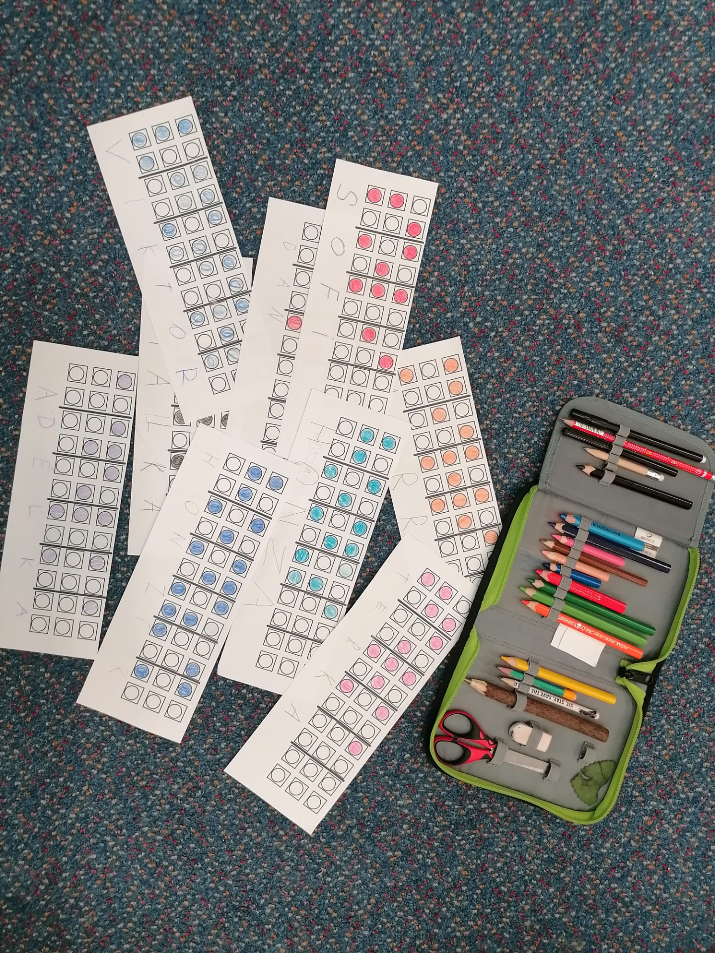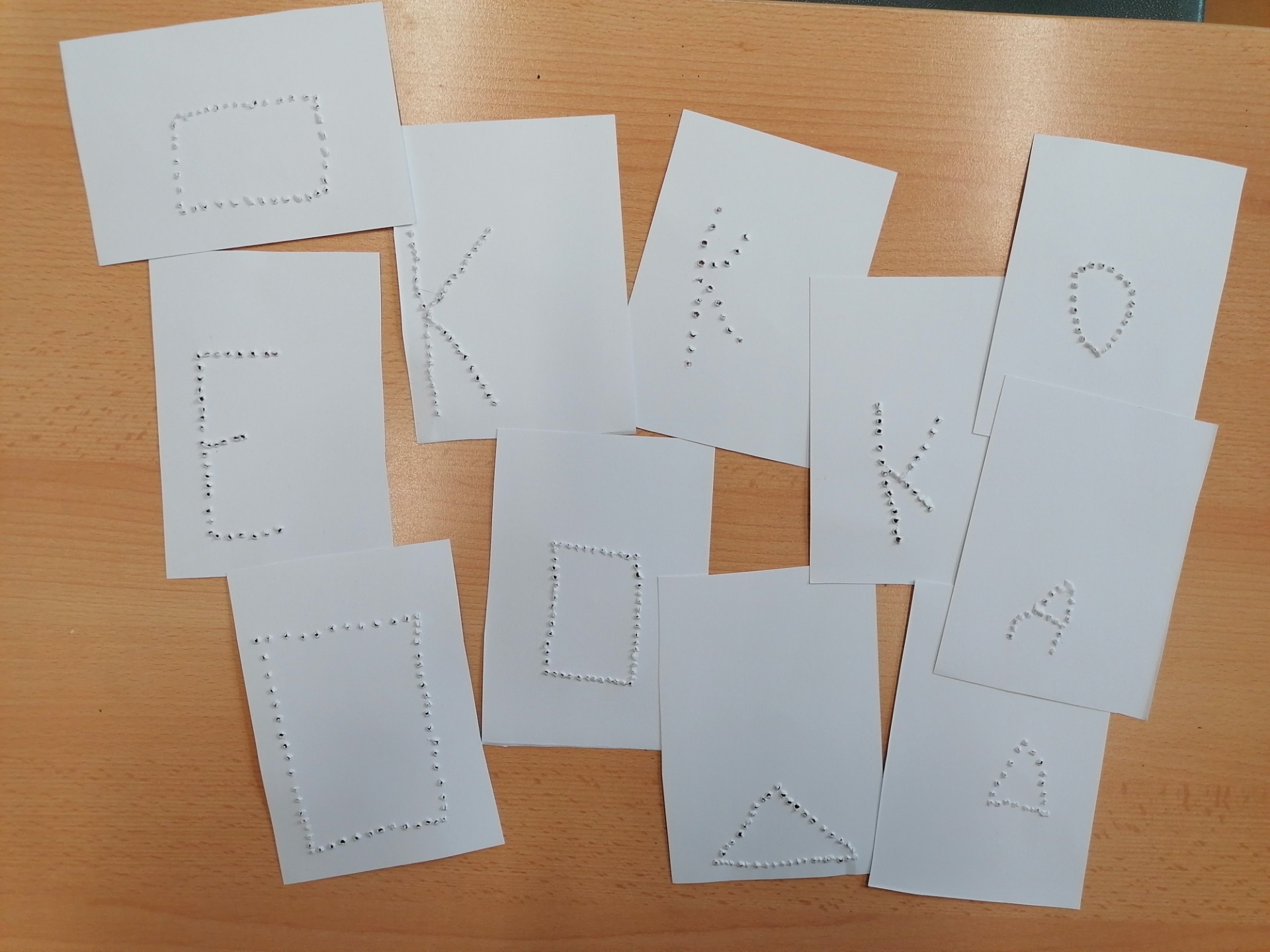 Den Braillova písma sice nevyšel na pátek, den naší tandemové výuky, nicméně nám toto téma přišlo natolik zajímavé a důležité, že jsme mu společně věnovali dvě tandemově vyučovací hodiny. Nejdříve jsme si vyzkoušeli vypichované obrázky – hřebíky, čtvrtka a pozor! …. měkká podložka, jinak bude vypichovaný obrázek i na lině, lavici atd.:-) V našem případě posloužil třídní koberec. Domluvili jsme se na jednoduchých tvarech (tiskací písmena, geometrické tvary), do obrazů typu da Vinci se nepouštějte . Poté jsme obrázky zamíchali na jednu hromadu a každý si se zakrytýma očima "přečetlohmatal" tvar. Všichni četli na 1.