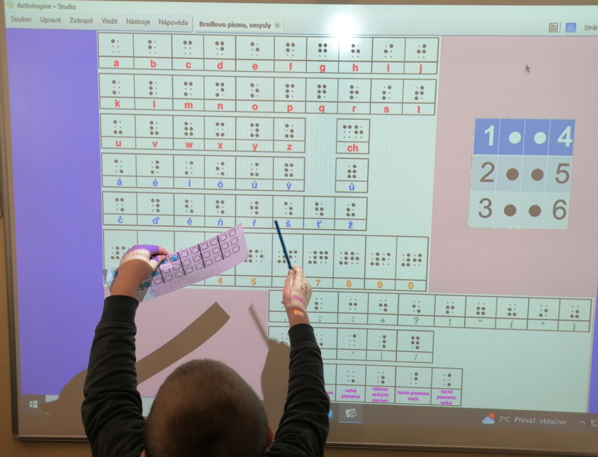 Řekli jsme si, kdo byl Louis Braille a dozvěděli se zajímavosti o tom, jak vlastně vznikl systém šestibodového písma. Zlatý hřeb miniprojektu zněl: napiš své jméno v Braillově písmu. Děti dostaly připravenou tabulku (uprav si své jméno tak, aby se vešlo do 6 písmen, Sebastian tam nenacpeš ). Braillova abeceda byla na interaktivní tabuli, každý pracoval tak, jak mu vyhovovalo, v lavici, na zemi, s kamarádem ….. Na závěr jsme si ještě ukázali psací stroje pro Braillovo písmo a poslechli si Andreu Bocelliho, slepého italského tenoristu.