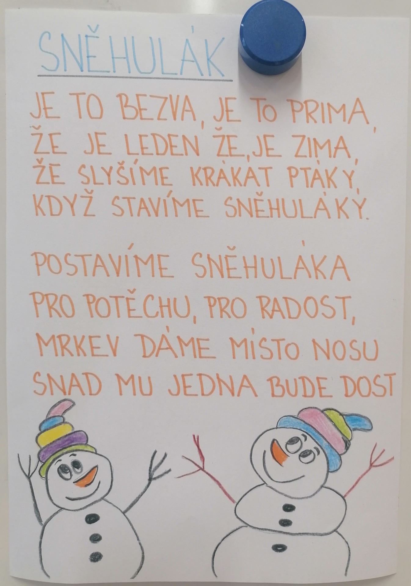Pantomima, pohyb, dramatizace, improvizovaný tanec ,,Zima". Opět jsme sáhly po našem oblíbeném Antoniu Vivaldim . Má tu výhodu, že jeho tvorbu lze využít po všechna čtyři roční období😊. Tentokrát jsme dětem prozradily i jeho přezdívku – ryšavý kněz -která samozřejmě zaujala. No a klasika, ,,Postavil jsem sněhuláka na stráni", zpíváme už dva týdny 😊.