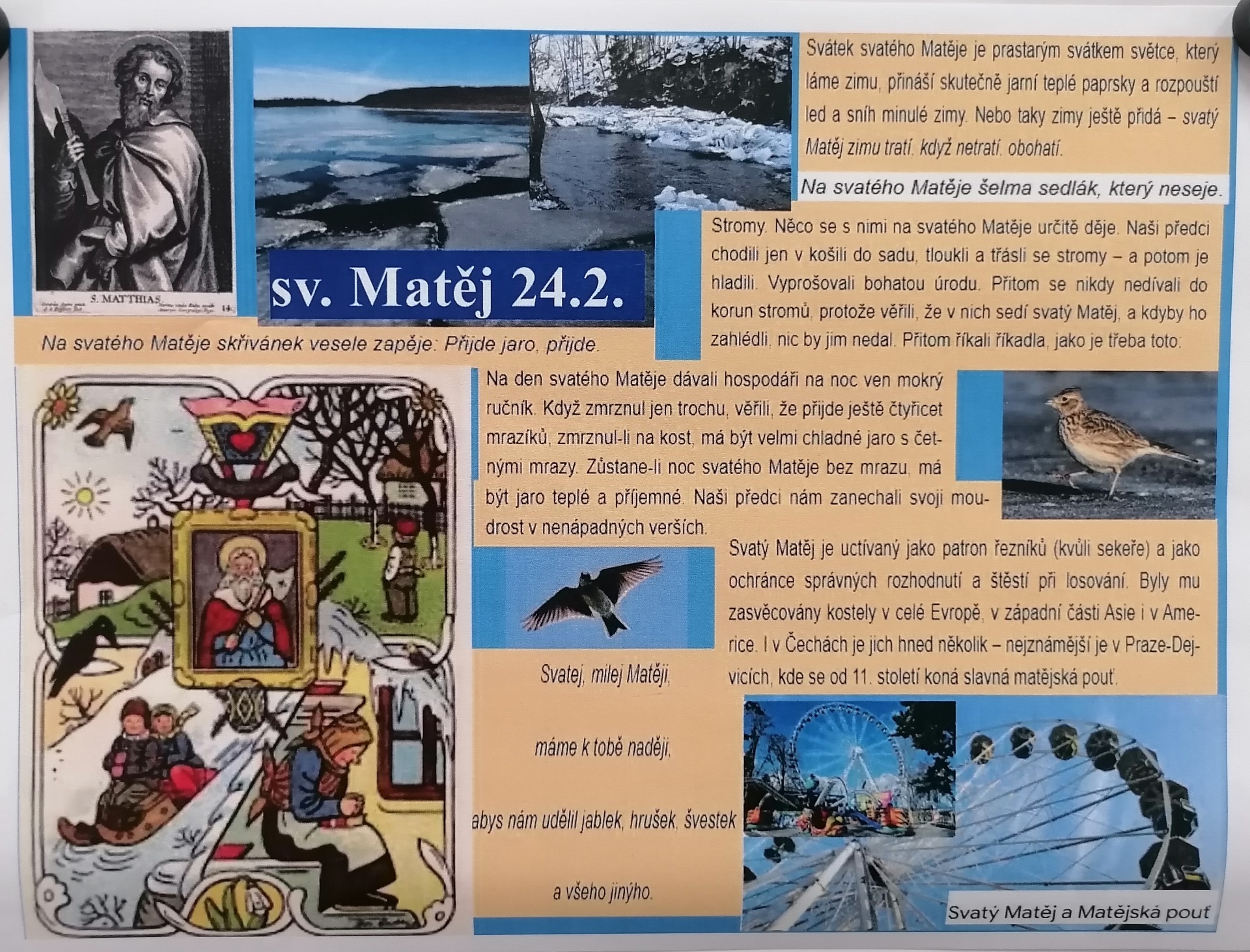 A také na svatého Matěje pije skřivan z koleje, sedláci chystají pluhy a traktory a v Praze začíná první a největší pouť roku. V tento den chodili hospodáři do sadů, třásli stromy a prosili Matěje o dobrou úrodu ovoce. Tento zvyk jsme z praktických důvodů nemohli absolvovat, neboť naše škola leží v historickém centru města a ovocných stromů je tu pomálu. No nevadí, vyzkoušeli jsme jiné zvyky😊.