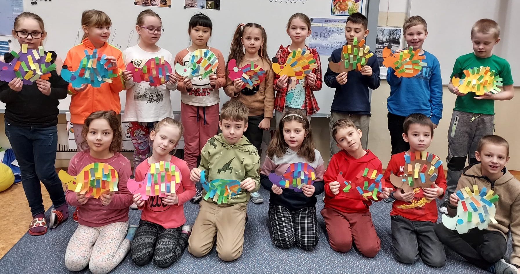 Výzdobu tříd jsme si připravili den předem. Vybrali jsme si fantasy ježky, něco jako ježčí hippie. Reální ježci jsou fajn, ale barvy jsou barvy . Třídní plyšák Moris ukázal všem spícího ježka, povyprávěl o zimním spánku a jak vlastně funguje u zvířátek hybernace.