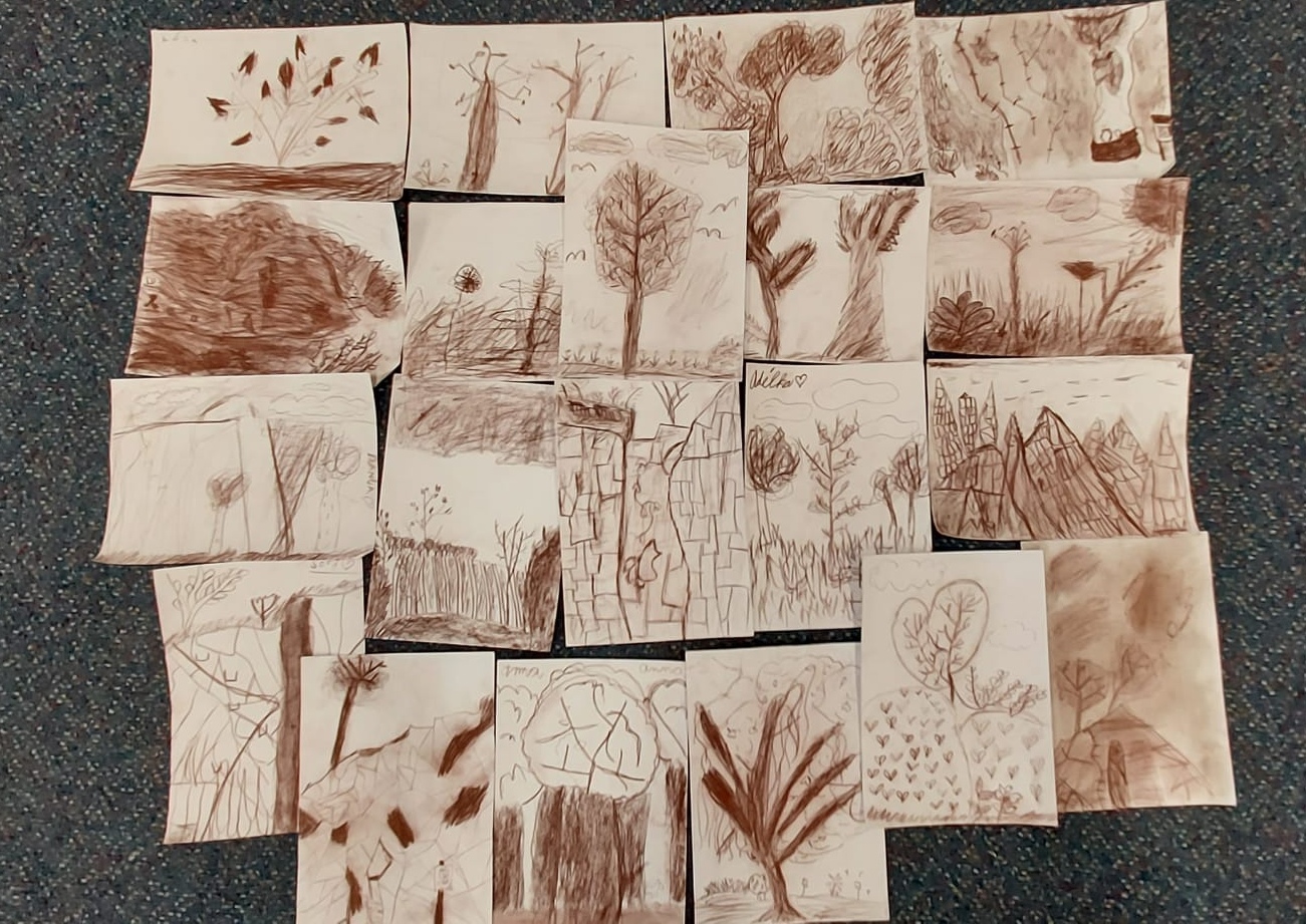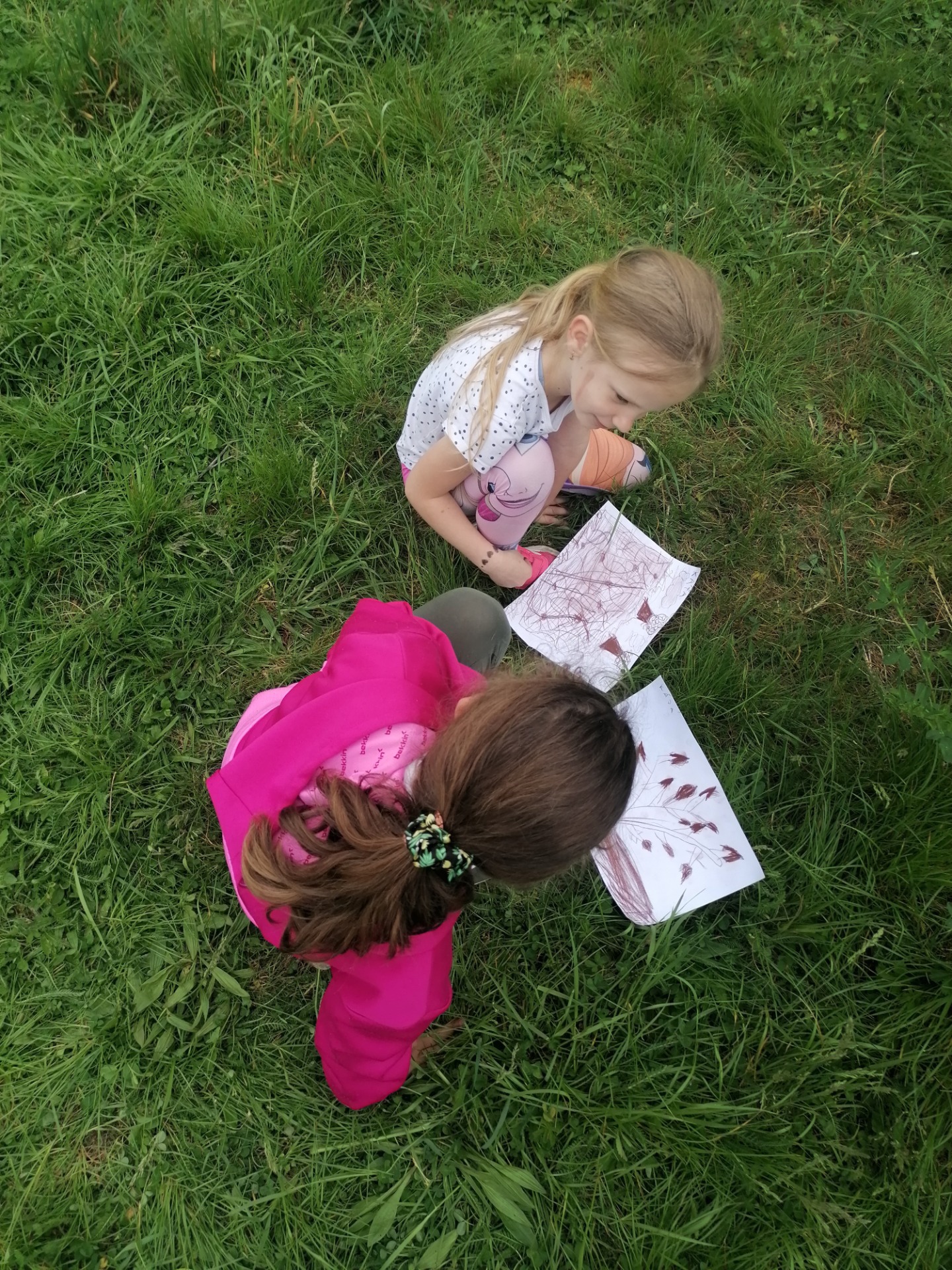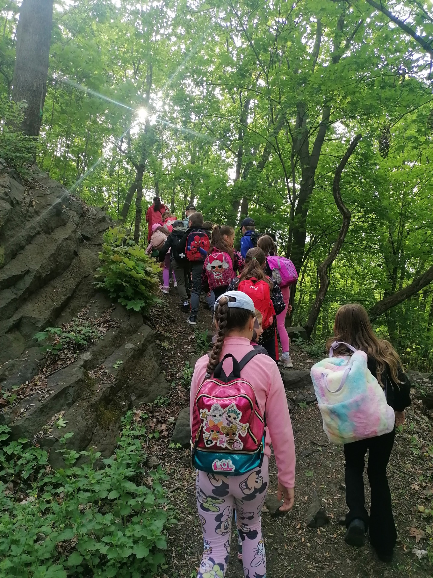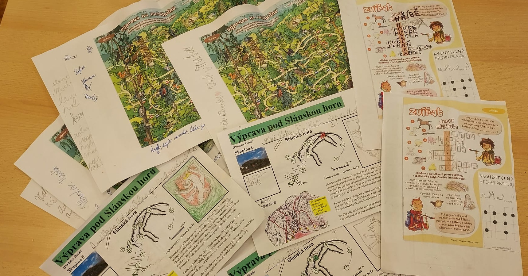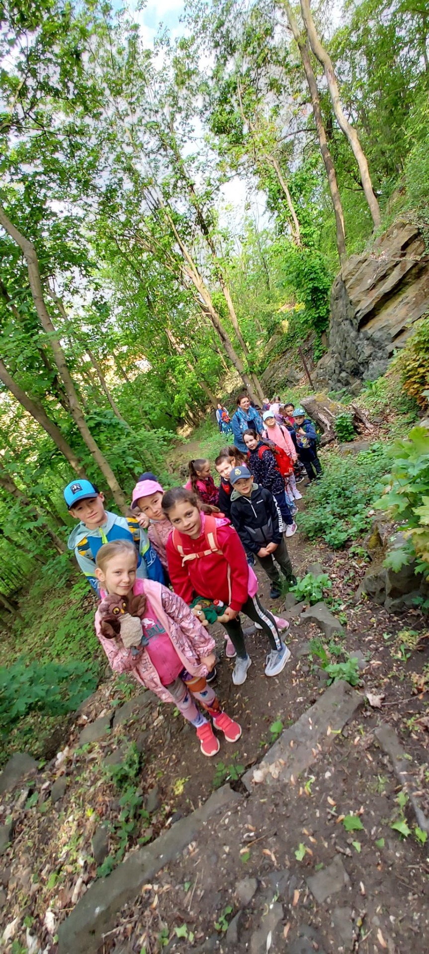 Po svačince jsme společně přešli k dalším úkolům – rozdělení do skupinek a práce s mapou, lesní bludiště, křížovka. Využili jsme průlezky, které pamatují ještě nás jako malé holčičky, takže tu stojí, řekněme, již delší dobu😊. Na louce jsme trénovali předávání štafety, místo štafetového kolíku nám posloužila šiška. Zjišťovali jsme informace o ferratě, která je na naší hoře už 8 let. Dokonce jsme měli možnost sledovat horolezce, kteří se sem vypravili ve stejnou dobu jako my. Jestli měli i oni stejnou radost z nás – těžko říct😊. Přece jen 40 diváků nemívají každý den. Naše hora je přírodní památka, řekli jsme si, co zde smíme a co naopak nesmíme. Nakreslili jsme si znak přírodní památky. Rozdali jsme si čtvrtky a rudky a kreslili, co vidíme okolo sebe ….ve třídě jsme později udělali zajímavou galerii😊.
