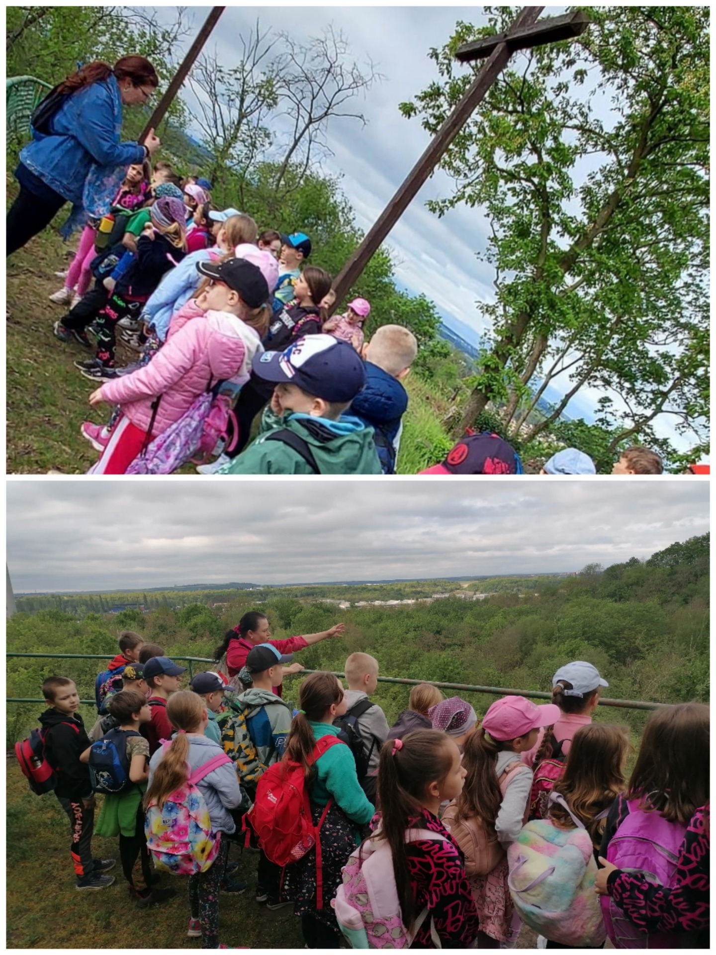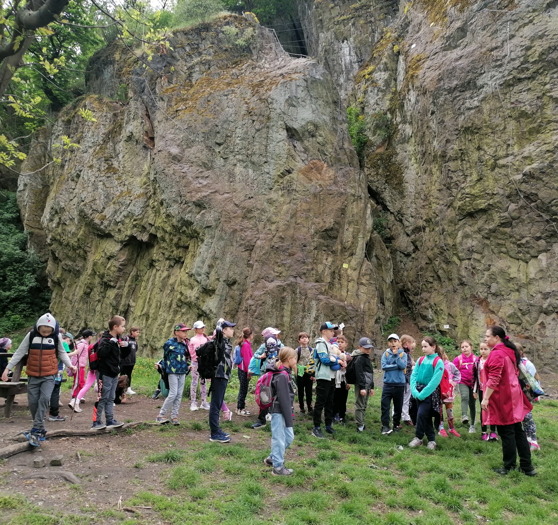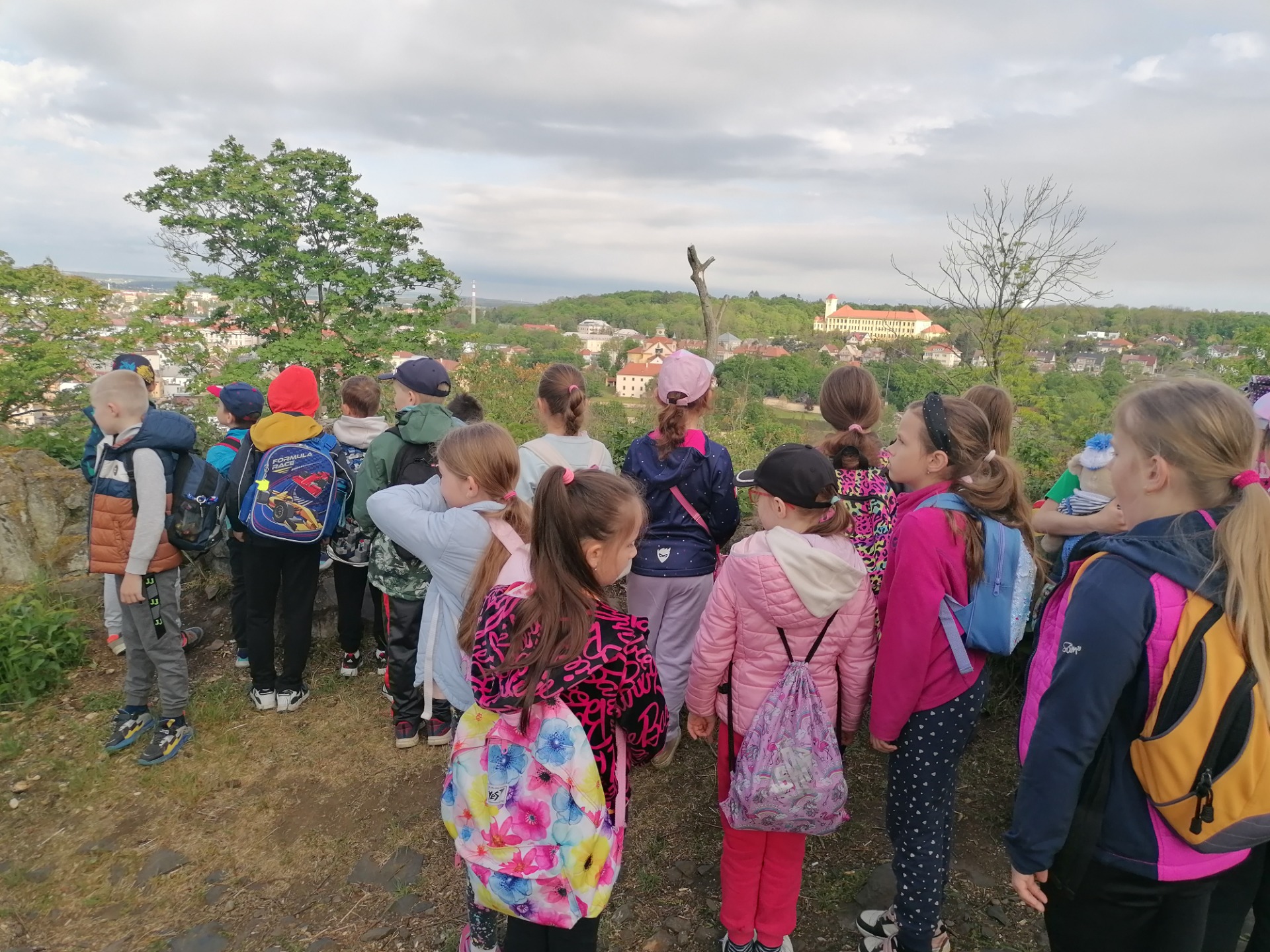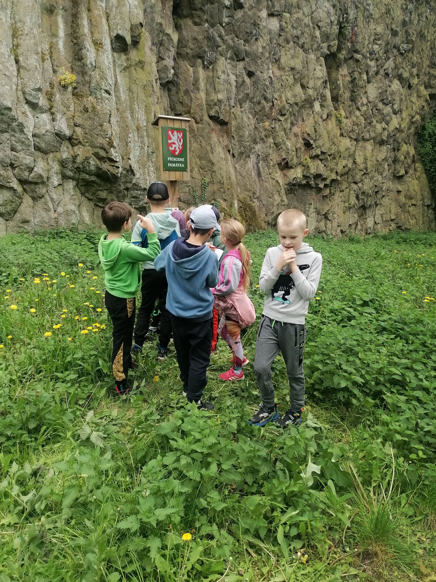 S sebou batůžek, sváču a penál a hned ráno jsme vyrazili. Nejprve jsme absolvovali výšlap na vrchol, dokud jsme čerství, žejo. Později by se nám asi šlapalo hůř. Počasí jsme vychytali, a tak jsme si nahoře na hoře užívali výhledy široko daleko, vyprávěli jsme si, co kterým směrem můžeme vidět, kdo najde svůj dům ….. a taky naši školu jsme si prohlédli pěkně shora. Na vrcholu hory stojí tři kříže, už od 17. století. Nechal je tu postavit pan hrabě, kterému naše město patřilo. Poslechli jsme si pověst o zrádci Ješkovi, který tajně pustil nepřátele do města☹. Vysvětlili jsme si, proč se z naší hory občas kouří. A také, že se tu těžil čedič, k čemu se čedič používá, jak se v přírodě pozná a prohlédli jsme si lom.