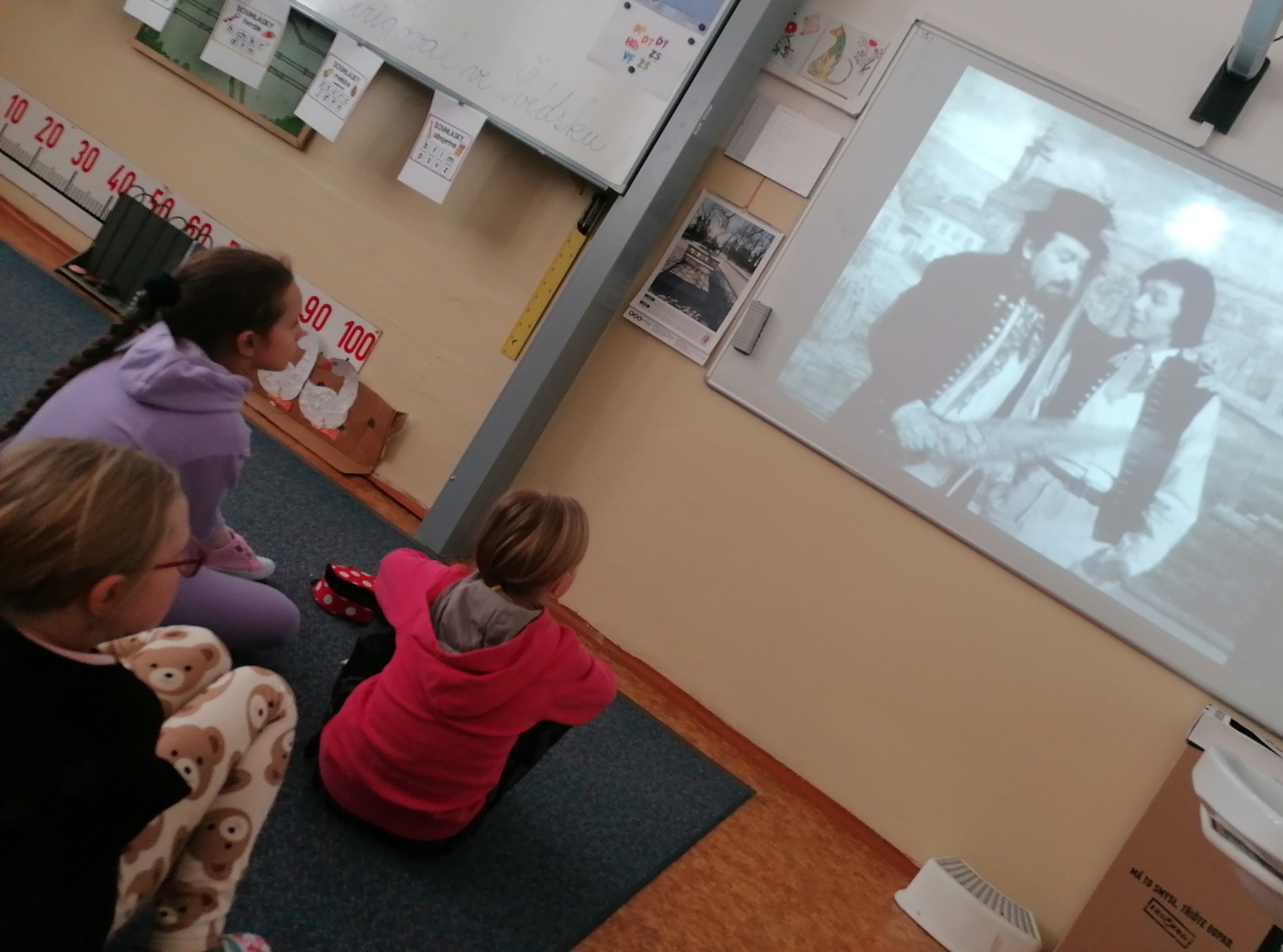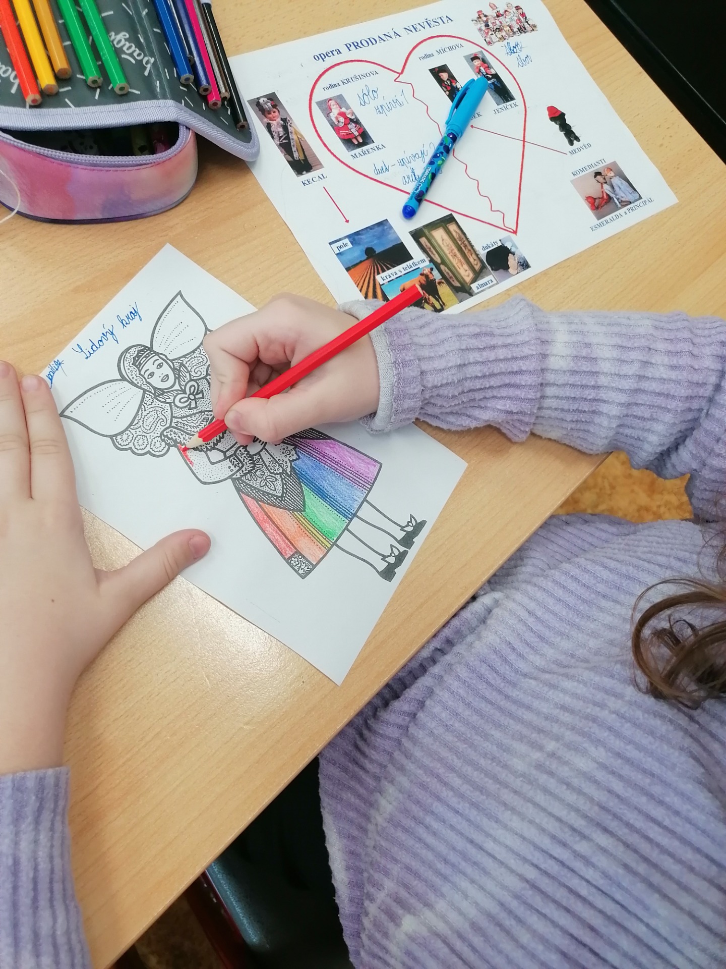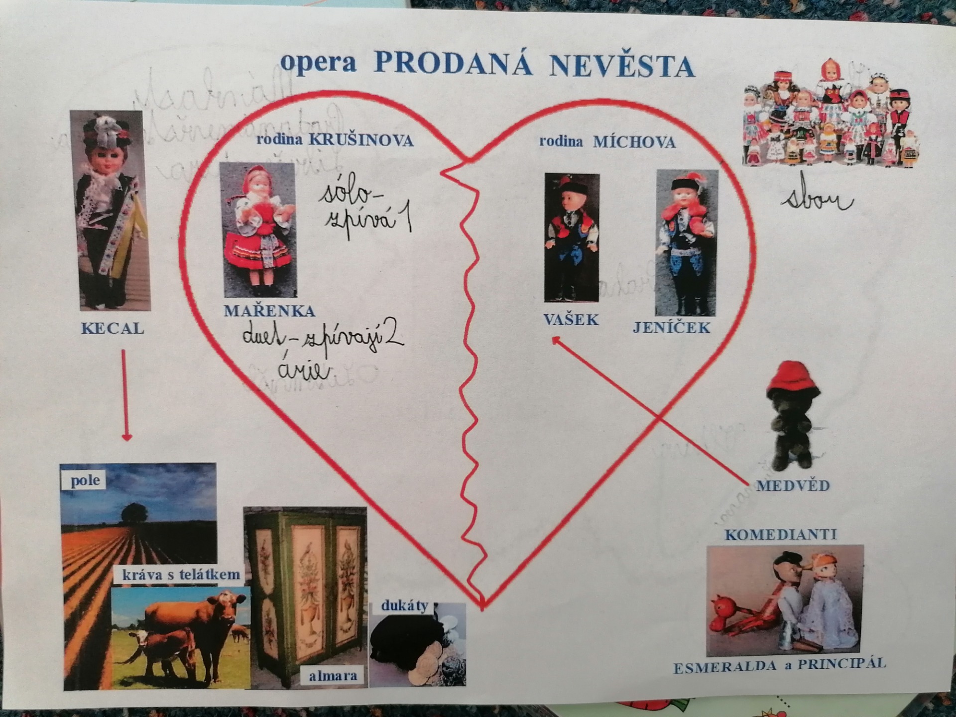 Následovala Prodaná nevěsta. Nejprve příběh rodinného propletence Krušinů a Míchů, a pak už ukázky nejznámějších kousků opery: Kecal s Jeníkem v podání Waldemara Matušky s Karla Gotta, zde byl hlavní úkol zapamatovat si, co všechno Kecal nasliboval. Věrné milování i hádka Jeníka s Mařenkou. Esmeralda přemlouvající Vaška, aby se stal medvědem. A nakonec Proč bychom se netěšili? (když se nám ten projektový den tak daří😊), tu jsme si i společně zazpívali. Vysvětlili jsme si pár slůvek z hudební teorie.